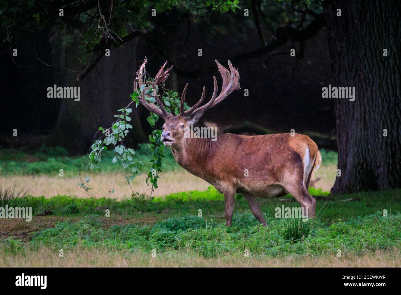 Duelmen Nrw Germany 21st Aug 2021 A Red Deer Stag Cervus Elaphus Has Been Rubbing Against Tree Branches To Aid Shedding And Gets A Branch Stuck In His Antlers Every Year Male